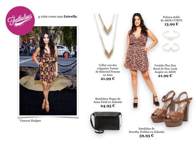 Hoy nos fijamos en Vanessa Hudgens, que aquí viste un vestido con estampado floral por encima de la rodilla, bolso negro tipo bandolera, sandalias de tacón en tono marrón con collar y pulseras doradas.